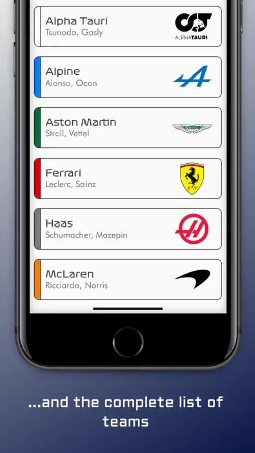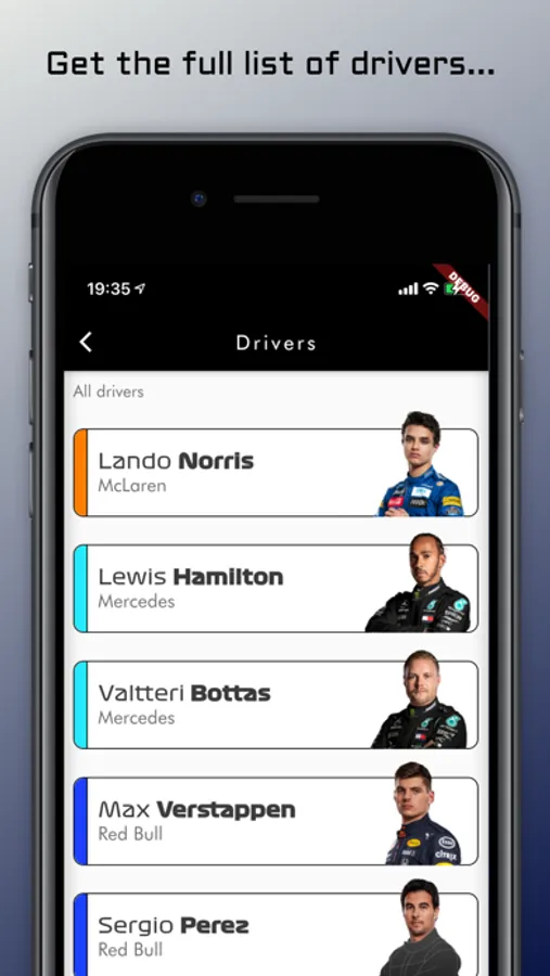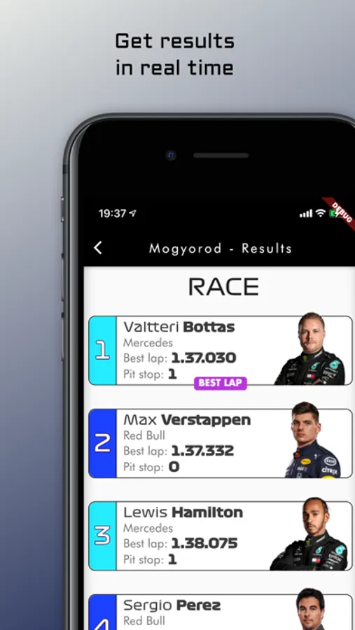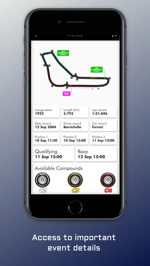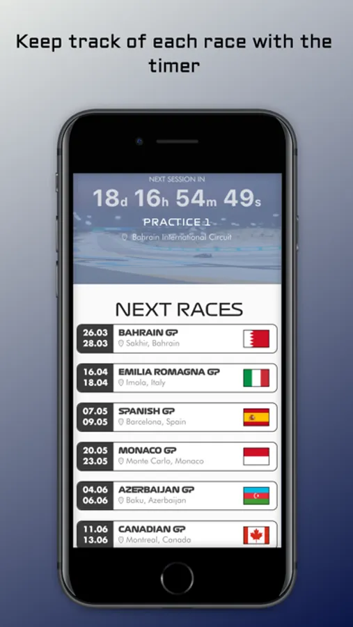 Keep track about the remaining time for every session with the countdown, get information about the tracks, the real-time scores, drivers, teams and many social features!