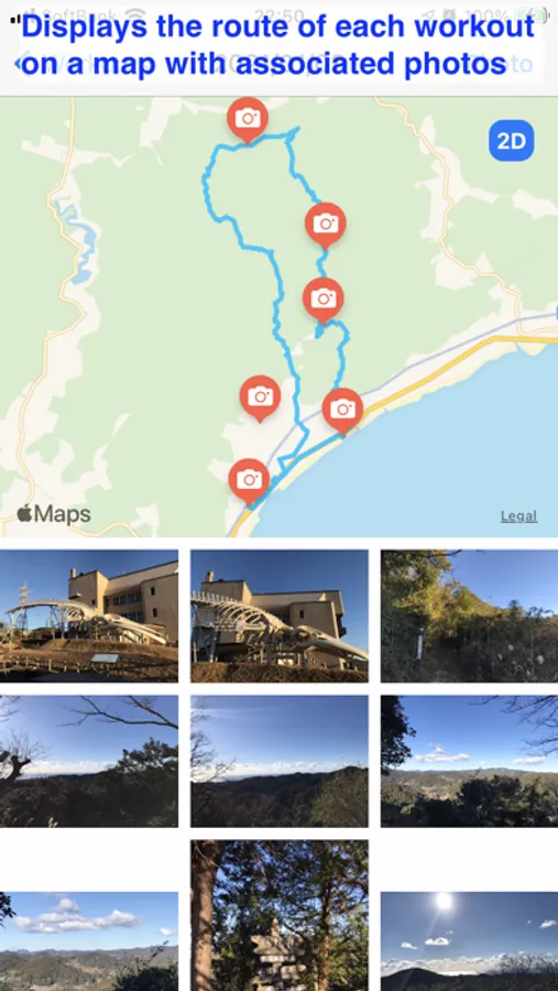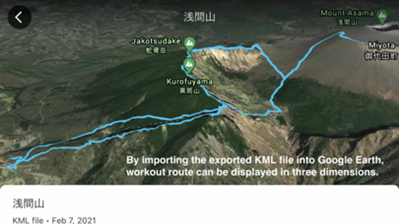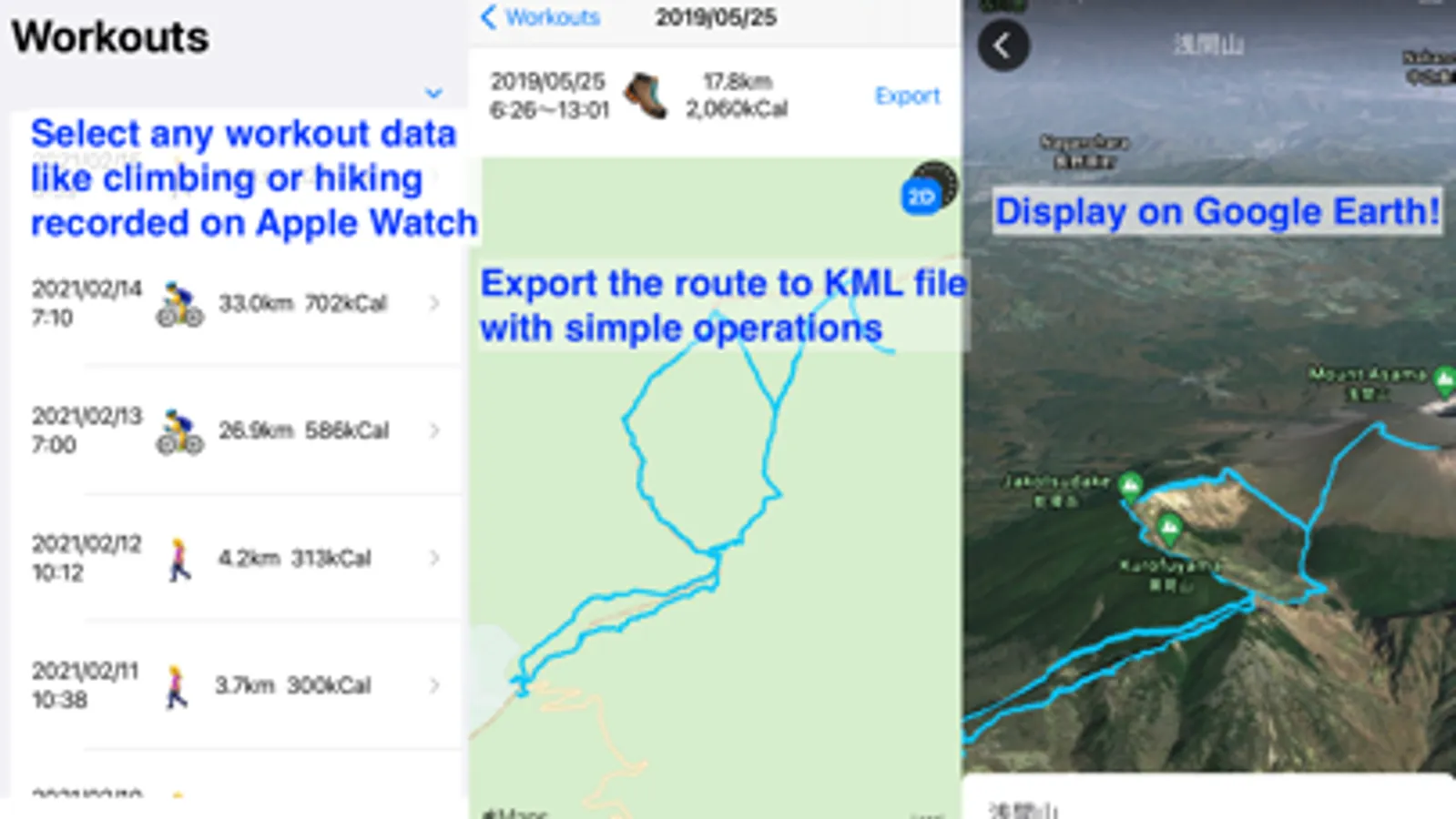 EarthTrail loads workout and route data recorded on iPhone using an Apple Watch or other device during exercise via Health/Fitness data and exports them as a KML file. The workout related photos will be able to exported as well. The exported KML file can be imported and displayed on Google Earth, allowing you to view your climbing route on 3D terrain. Google Earth for Mac can also display exported photos on 3D map.