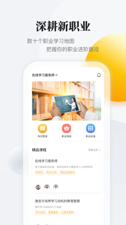 每个新职业对应一个知识图谱,包含该职业所有的知识进阶能力,让你的职业进阶路径一目了然。“职业标准”和“职业等级”,为申报职业技能等级鉴定做支撑。