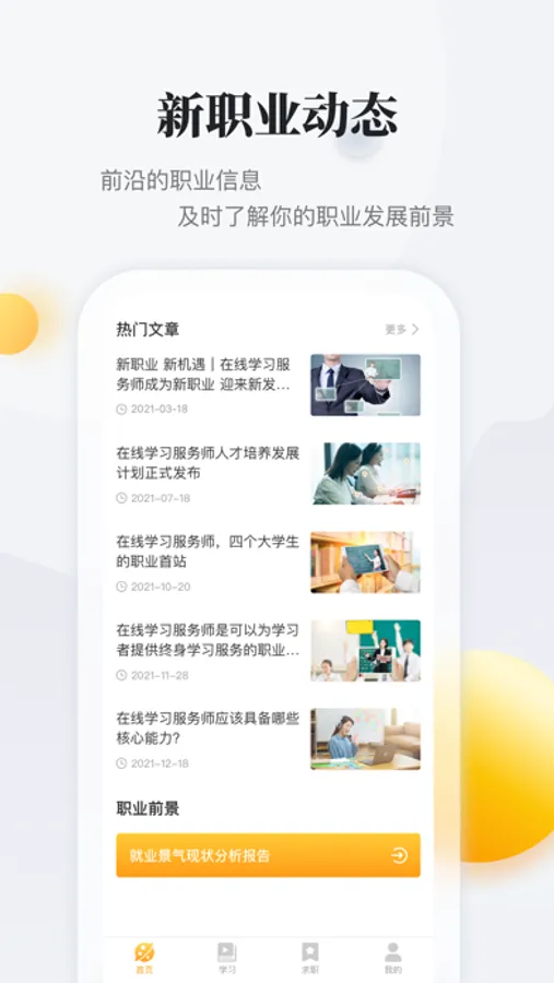 推送在线学习服务师、呼吸治疗师、互联网营销师、物联网安装调试员等多个新职业的前沿信息,包含职业前景、市场规模、职业深度报道等,助你了解自己的职业发展前景~