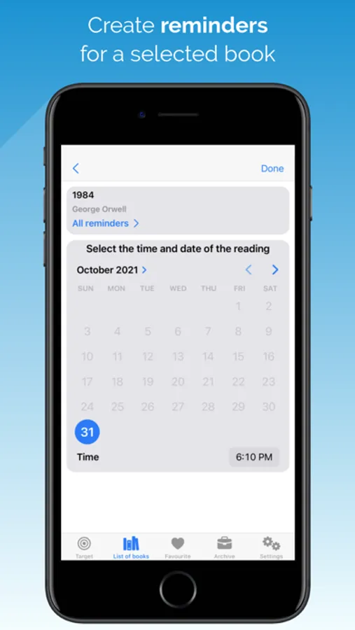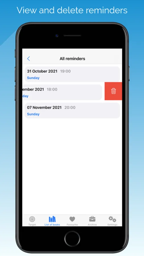 REMINDERS. Setting reminders to read the selected book, the availability of viewing the list of created events and deleting.