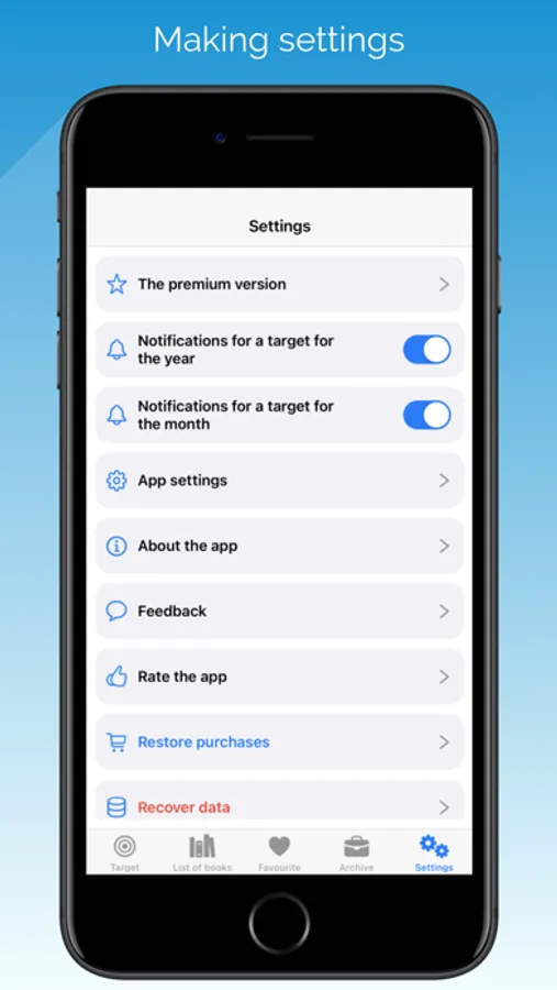 FLEXIBLE SETTINGS. Disable notifications about the achievement of targets for the year and month (enabled by default), go to the standard application settings, feedback, restore purchases and other options.