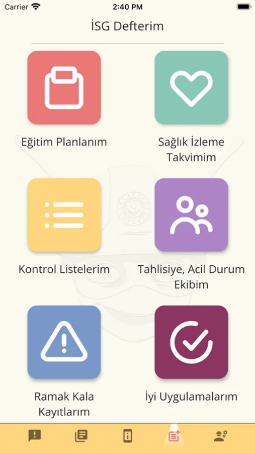 *İSG Defterim: Bu modül sayesinde kullanıcı işyerlerine özgü kontrol listesi, eğitim planı, sağlık izleme takvimi, tahlisiye ve acil durum ekibi, ramak kala kayıtlarını, iyi uygulamalarını ve notlarını telefonlarına kayıt edebileceklerdir.