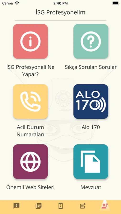 *İSG Profesyonelim: Modülde bulunan İSG Profesyoneli Ne Yapar?, Sıkça Sorulan Sorular, Önemli Web siteleri, Mevzuat ve Yayınlar arayüzleri sayesinde kullanıcı iş sağlığı ve güvenliği ile ilgili ulusal ve uluslararası düzenlemeler hakkında bilgi sahibi olabilecek, bilgi almak istediği konular ile ilgili Alo 170 arayüzünden Bakanlığımızın Alo 170 hattına kolayca erişim sağlayabilecektir. Bunun yanı sıra Acil Durum Numaraları arayüzü ile de ihtiyacı olduğu durumlarda ilgili telefon bağlantılarına kolayca ulaşabilecektir.