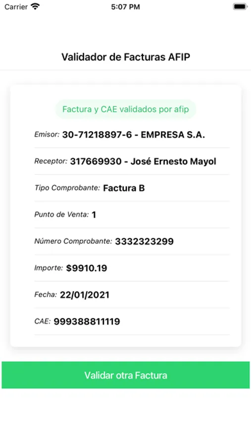 La aplicación determinará si el CAE del emisor es válido o inválido.