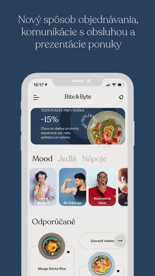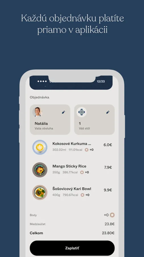 Naša aplikácia ponúka okrem úpravy jedla/nápojov a výberu obsluhy aj priamu platbu a následné hodnotenie objednávky.