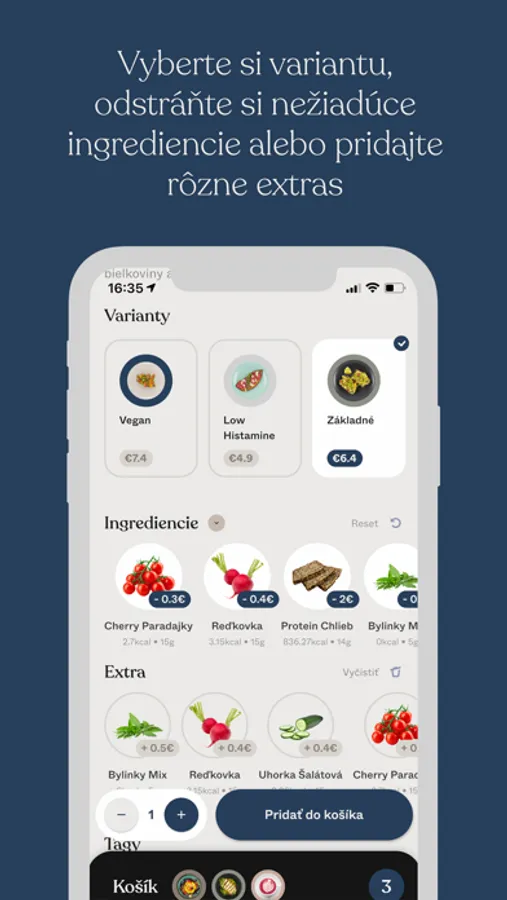 Prinášame mobilnú aplikáciu, ktorá umožňuje absolútnu variabilitu skladby jedla, špecificky prispôsobenú k preferenciám ľudí, zohľadňujúc intolerancie a stravovacie návyky.