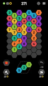 Place hexagonal blocks with numbers on the honeycomb grid. Collect the same numbers in the blocks in a row to combine them and get a nine. Be careful - the field can fill up quickly! This is a simple puzzle with a combination of hexagonal blocks and an excellent training for the brain.