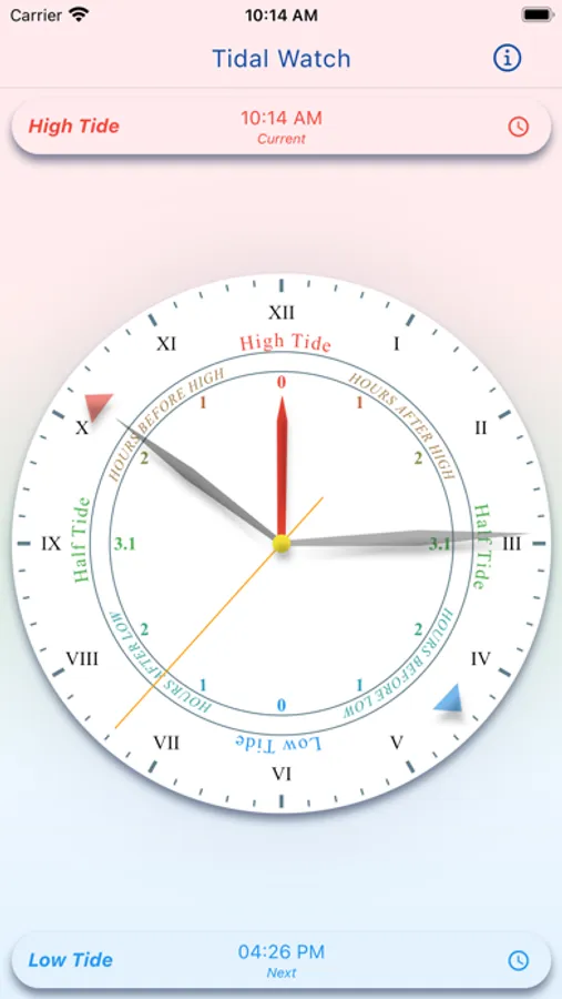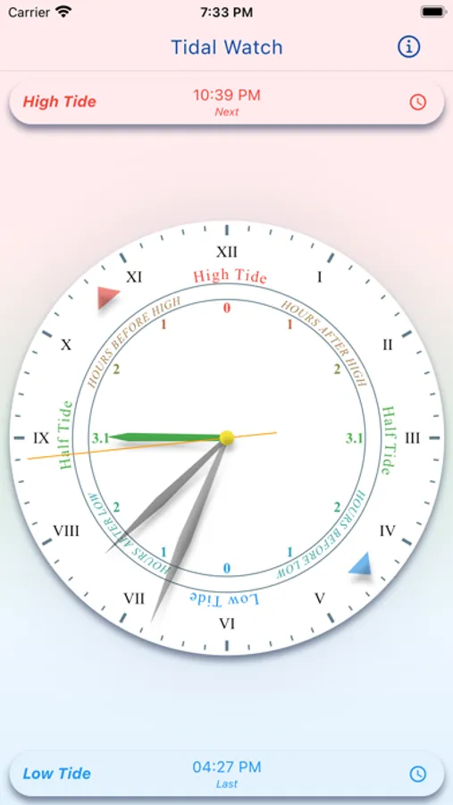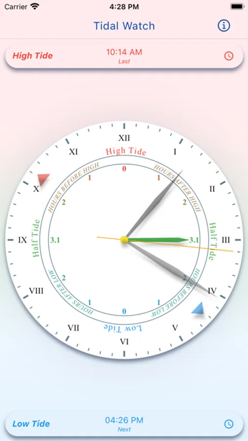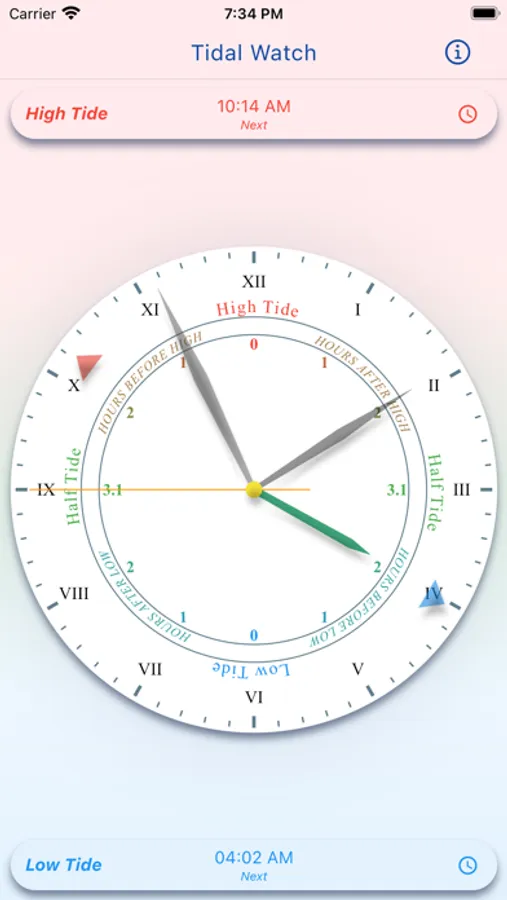 Set the high or low tide time based upon your location, and Tidal Watch will continuously display tide predictions indicated by the tide arrow clock hand.