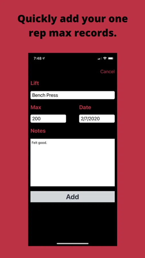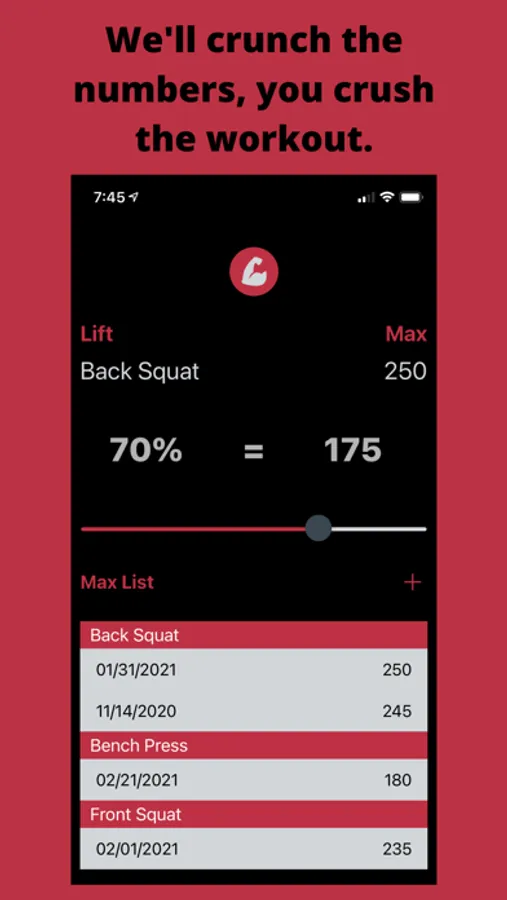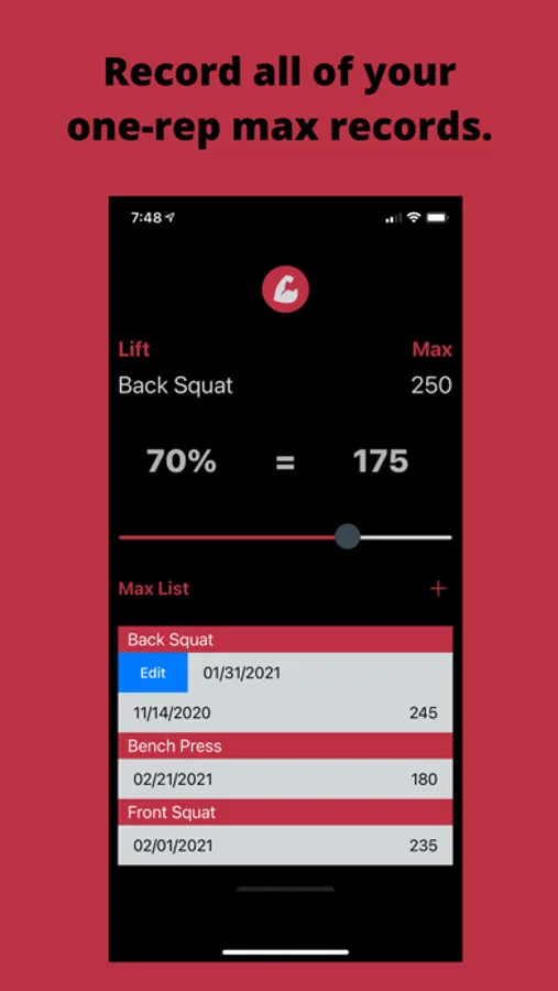Forget your one rep max? Don't want to do the math to figure out the percentages of your one rep max during your workout? Max Tracker Pro is a free app that allows you to record your one rep maxes for any lift and quickly recall them during your workout. The convenient slider allows you to easily compute any percentage for your one rep max.