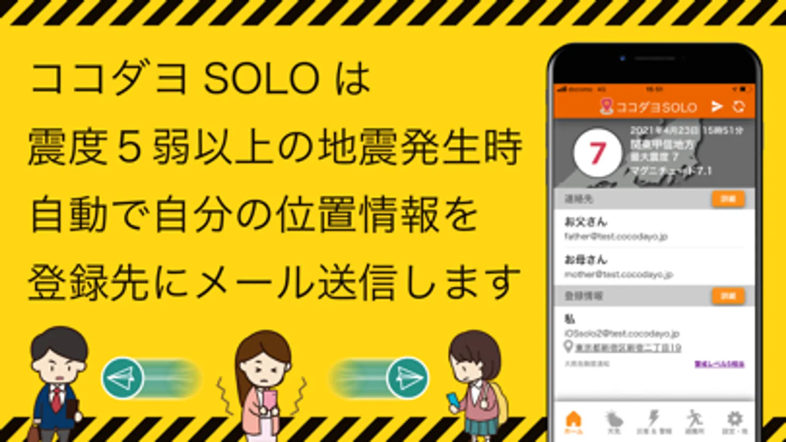 ・『ココダヨ』は、あなたの居場所が、設定によって緊急地震速報が発令されていない時でも確認できますが、『ココダヨSOLO』では、緊急地震速報のみ となります。