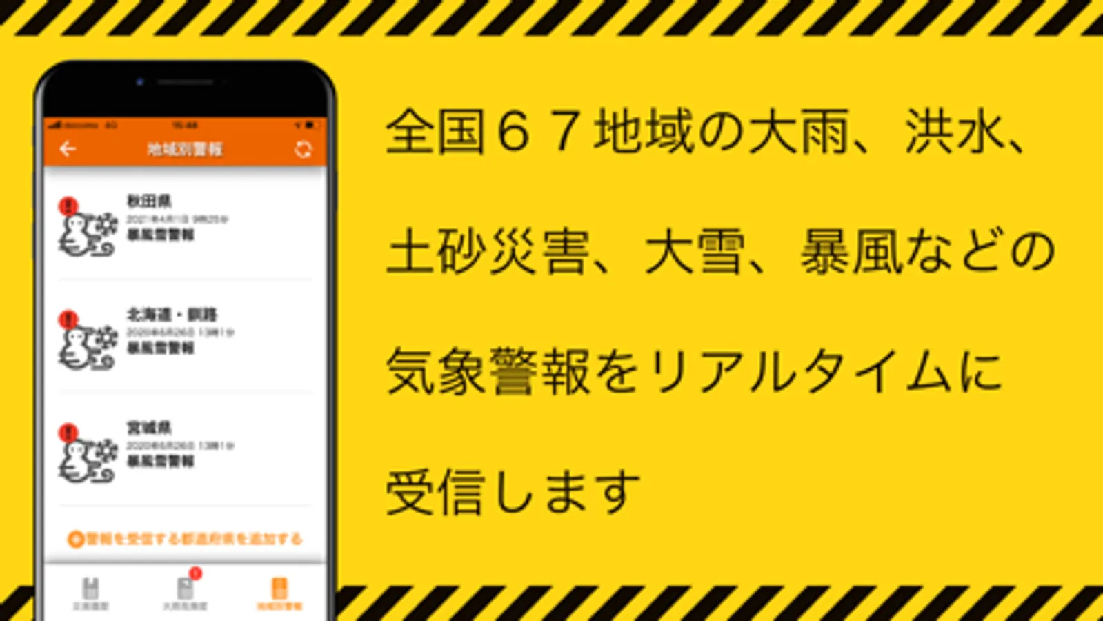 ・地震のみならず、地域ごとに発表されている大雨、洪水、土砂災害、大雪、暴風などの気象警報をリアルタイムに受信できます。