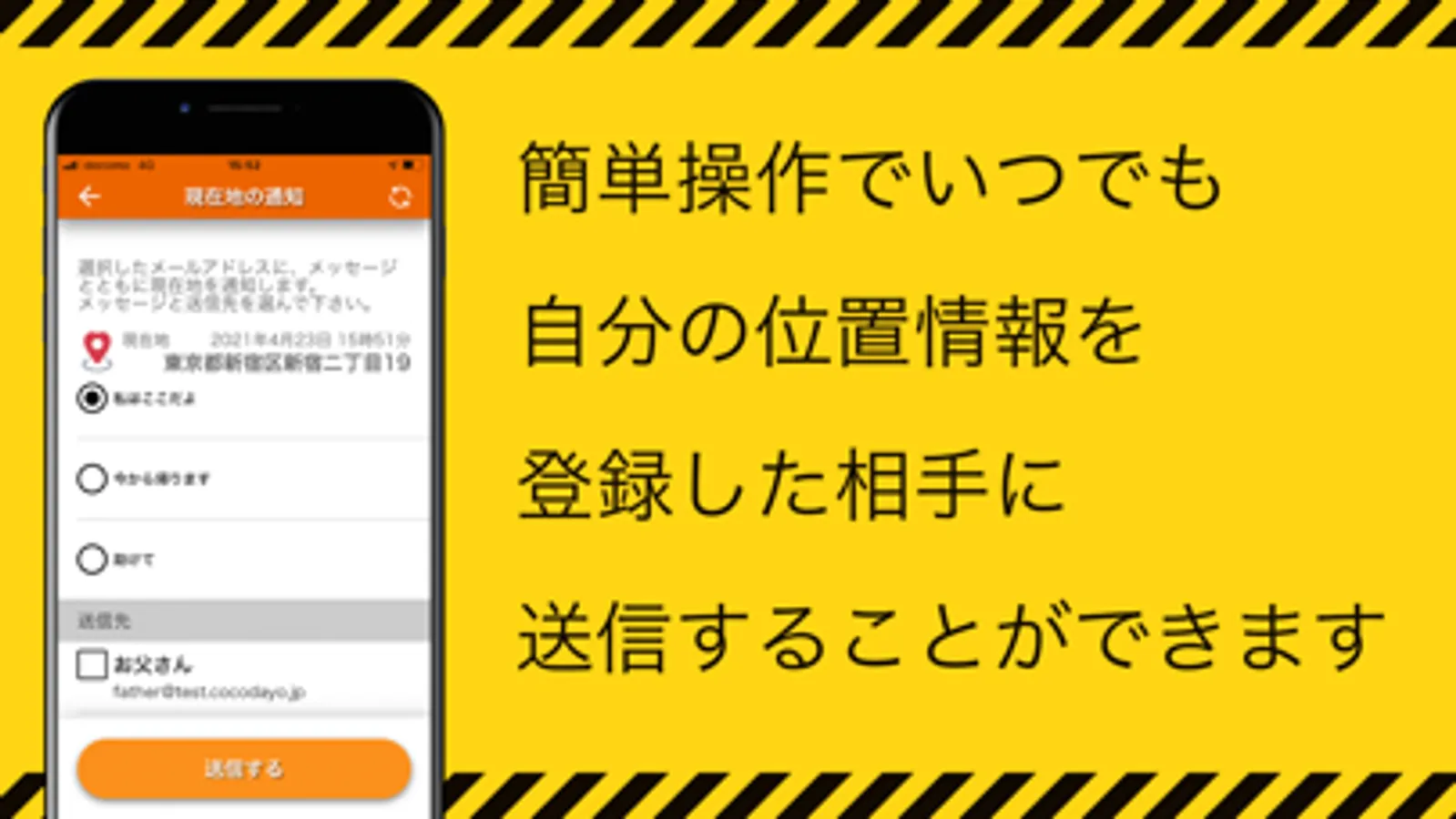・あなたの居場所と一緒に、3つのメッセージ:「私はここだよ」、「今から帰ります」、「助けて」から選んで送信できます。