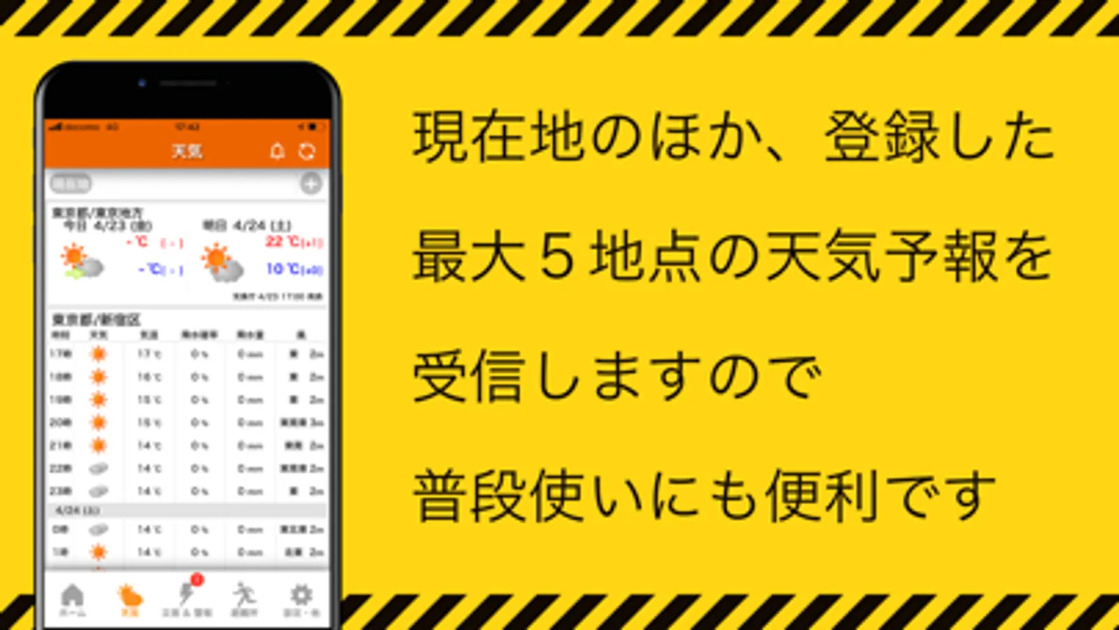 ・現在地のほか、登録した地点の天気予報(今日明日・時間帯毎)を受信できます。