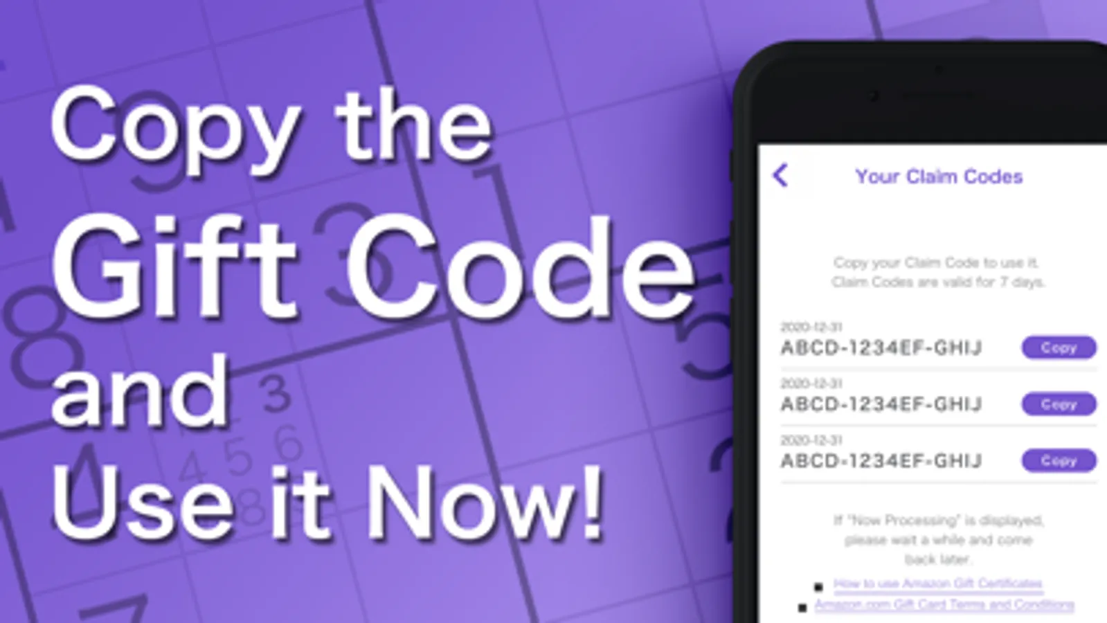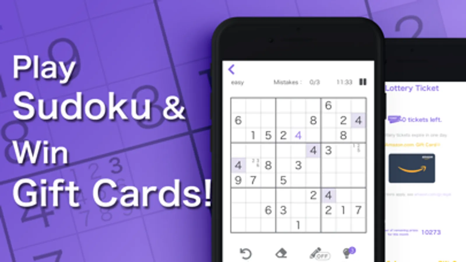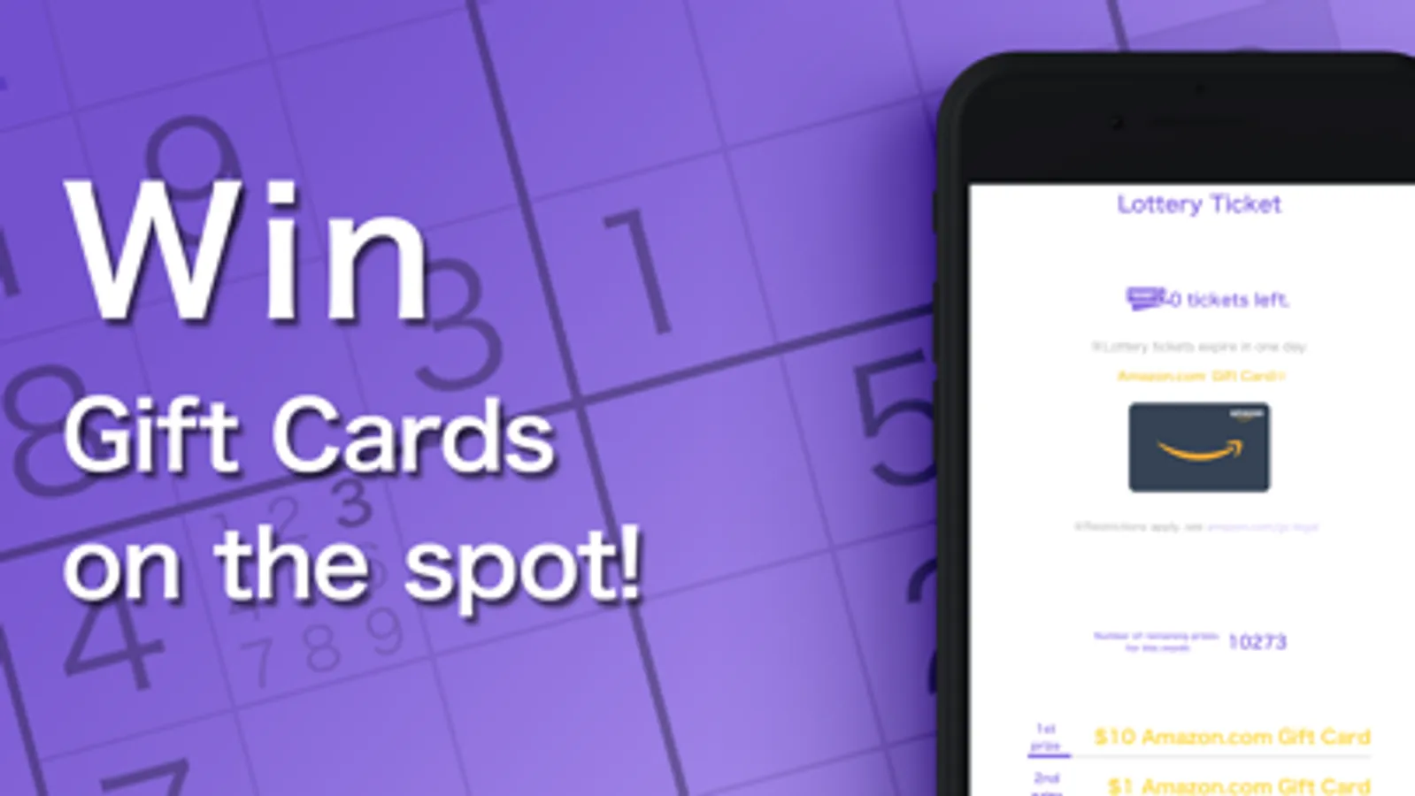 This is a classic Sudoku puzzle app. By completing puzzles you get a chance to win Amazon.com Gift Cards* sweepstakes. If you win, the gift code will appear on your screen immediately. Copy the gift code and use it now!