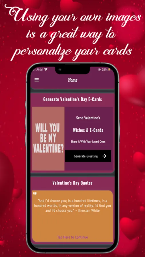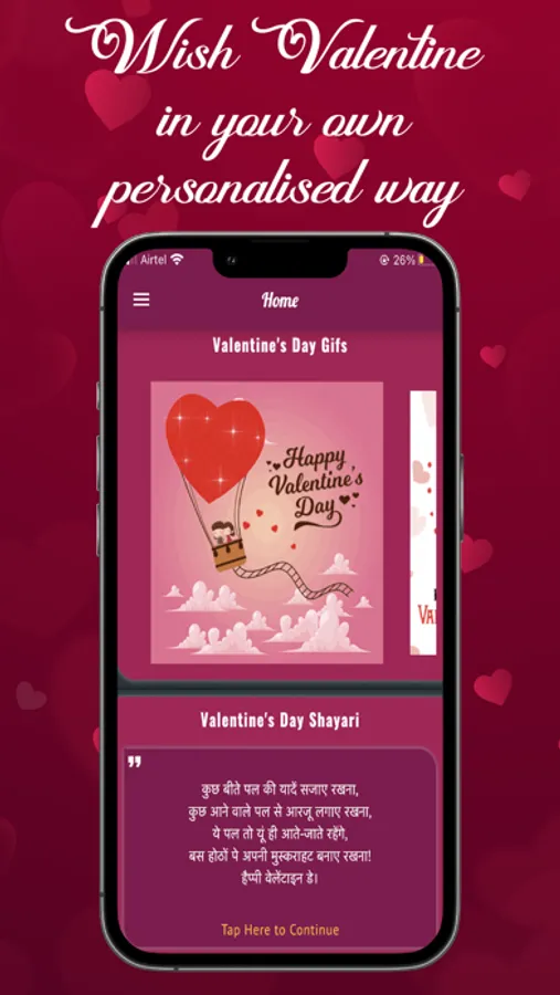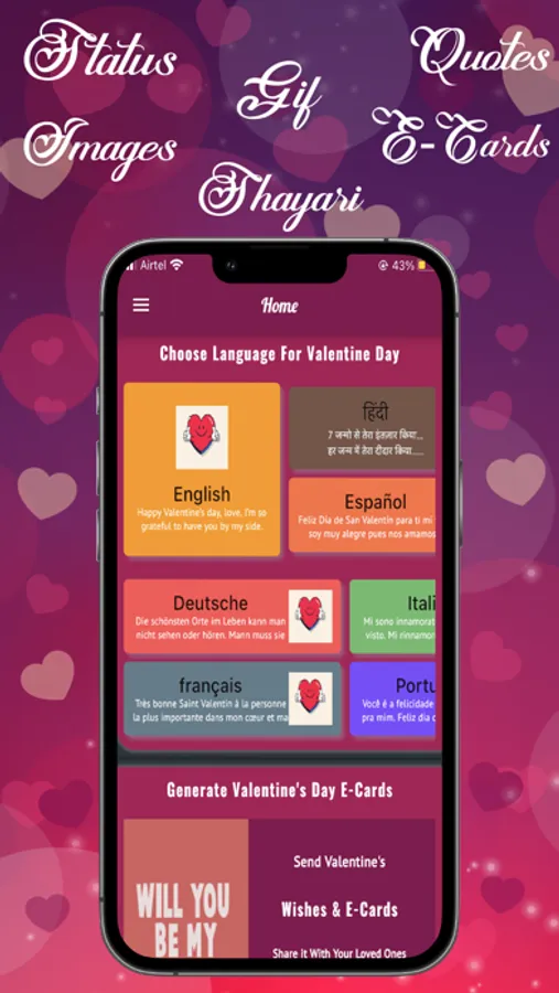 This app brings you the best collection of Text,Images, Gifs, Messages, Quotes, Shayari, Status, Meme, e-cards of Valentine's Day & Romance .