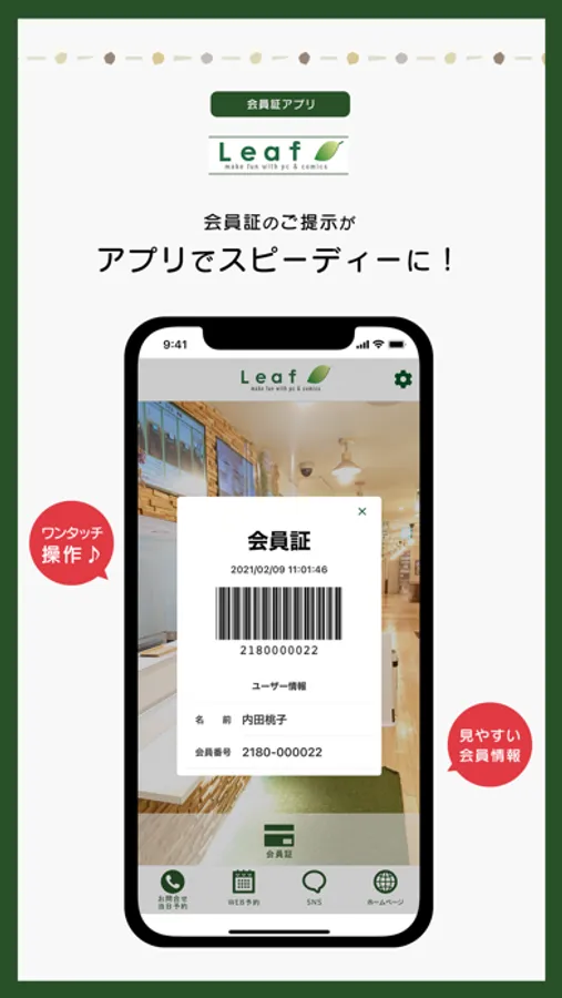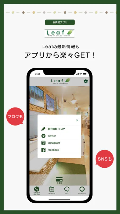 会員証をアプリ起動からワンアクションで表示。ご入店時の煩わしい会員証提示をアプリで簡単に提示できるアプリです。新刊情報や各SNS、ホームページへのリンクもあるのでLeafの情報全てをこのアプリから確認することが出来ます。