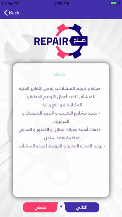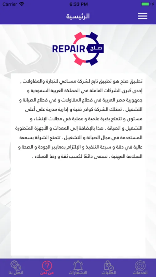تطبيق صلح هو تطبيق تابع لشركة مســاعي للتجارة والمقاولات , إحدى كبرى الشركات العاملة في المملكة العربية السعودية و جمهورية مصر العربية في قطاع المقاولات و في قطاع الصيانة و التشغيل . تمتلك الشركة كوادر فنية و إدارية مدربة على أعلى مستوى و تتمتع بخبرة علمية و عملية في مجالات الإنشاء و التشغيل و الصيانة . هذا بالإضافة إلى المعدات و الأجهزة المتطورة المستخدمة في مجال الصيانة و التشغيـل . تتمتع الشركة بسمعة عالية في دقة و سرعة التنفيذ و الإلتزام بمعايـير الجودة و الصحة و السلامة المهنية . نسعى دائمًا لكسب ثقة و رضا العملاء .