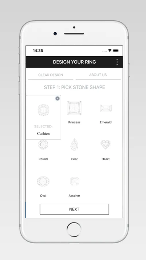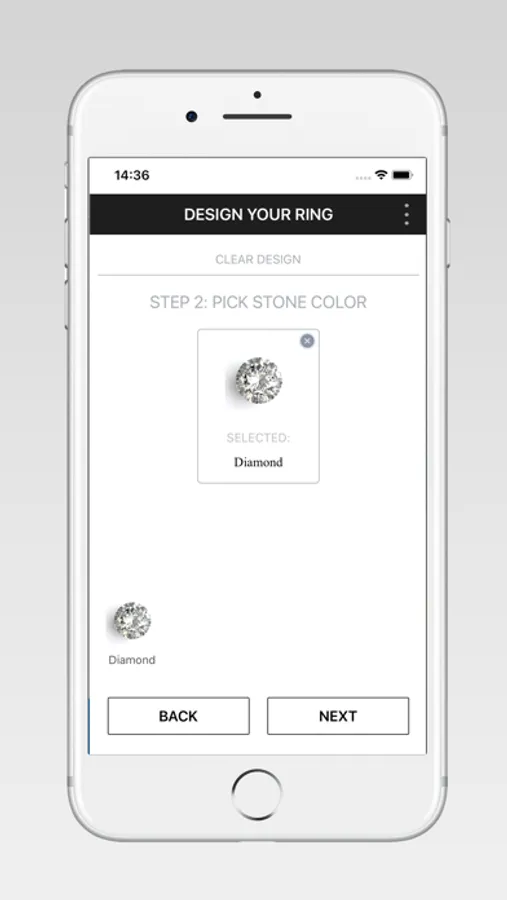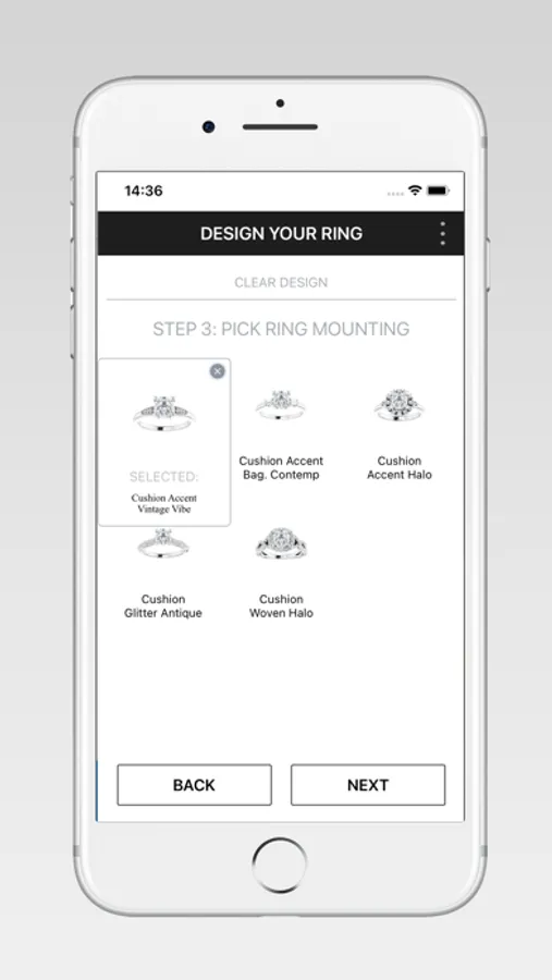 When Rock optic opens, you will Select your center stone shape-just tap your choice and hit Next until you have chosen your mounting ring style, metal color and stone color