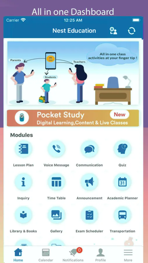 Nest K12 Education App is a platform which helps students, Teachers and Parents get connected. A common tool to interact, share & learn together via dynamic tools of this Web/App. Here, everybody is free to learn & grow via digitally connected campus of an institute which help an individual in daily activities like sharing digital materials, discuss on board, creating and participating in live tests, notice board, Calendar module and many more.