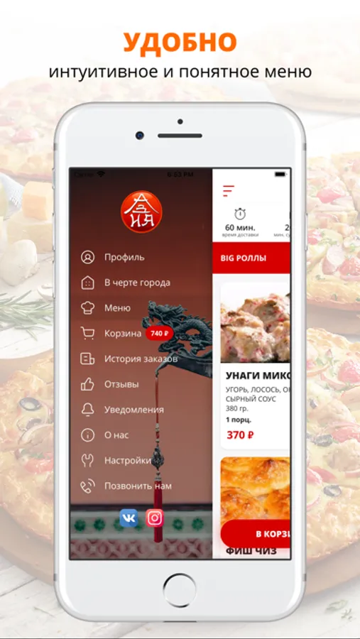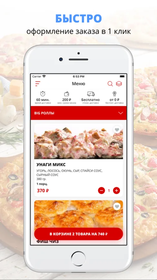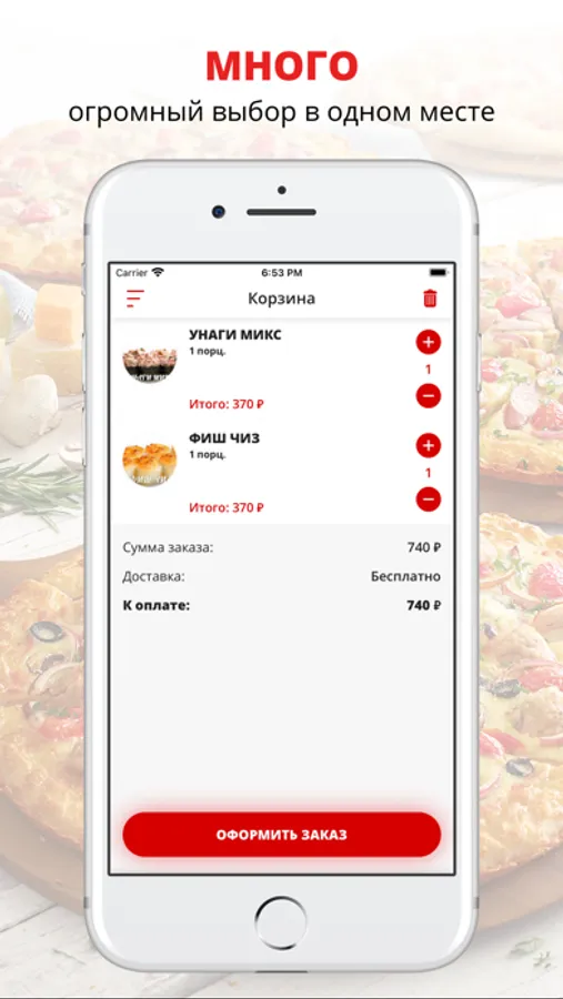 Заказ и доставка пиццы, суши, роллов, салатов, супов, десертов, напитков.