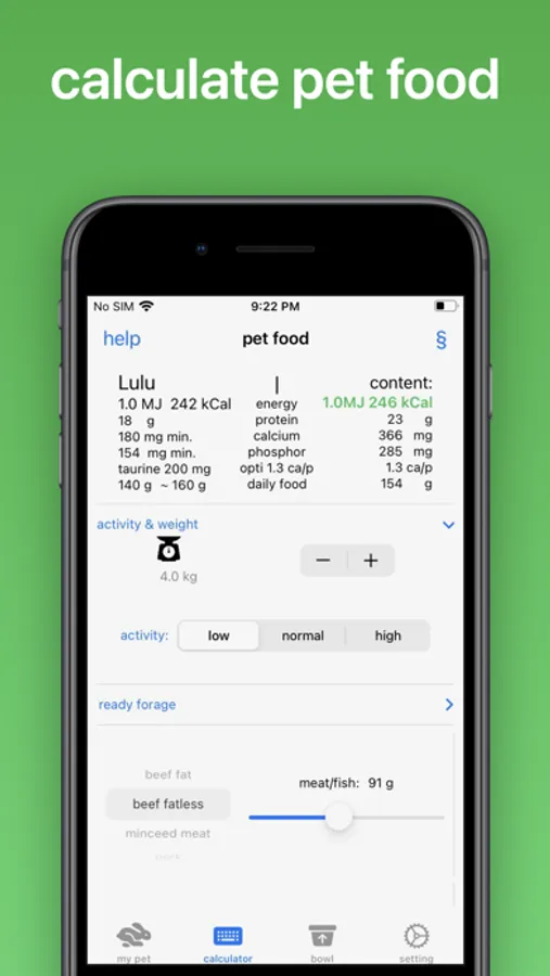 Your dog or cat needs different nutrients and minarals depending on their age and weight. The app pet food fresh helps You choosing age and weight, to compile individual the best balanced nutrition. Pet food fresh accompanies You through the entire life of your pet, from puppies to any age, when your pet needs completely different food.