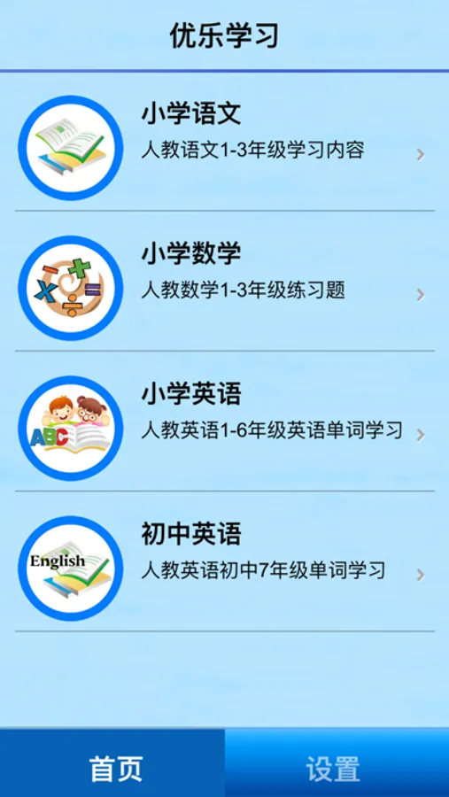 应用里是小学语文,小学数学,小学英语,以及初中英语等内容。