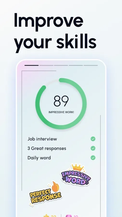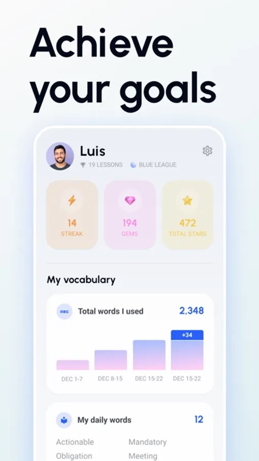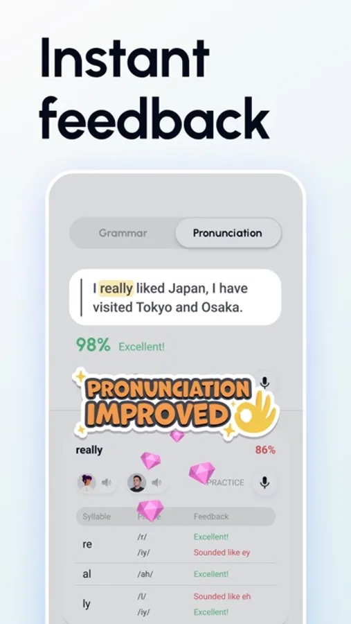 * Track your learning trends to top your daily English fluency score. Perfect your pronunciation and accent by beating your weekly goals.