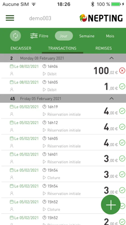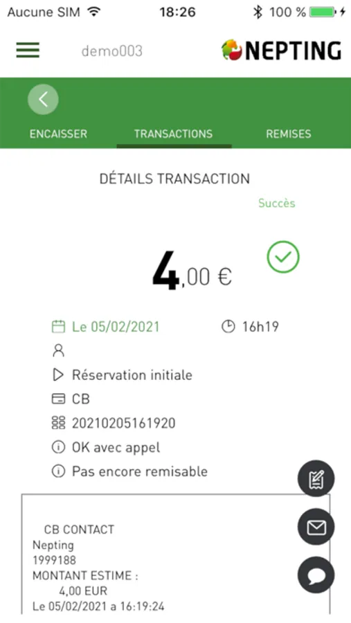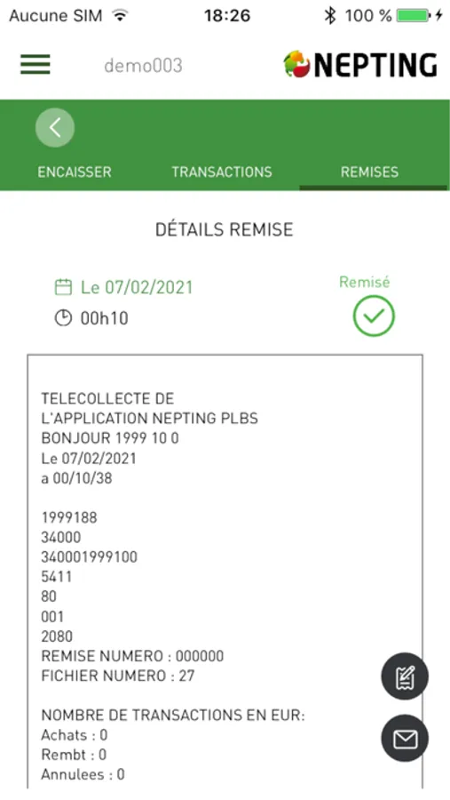 L'application permet également de consulter le suivi des transactions et remises de l'utilisateur connecté.