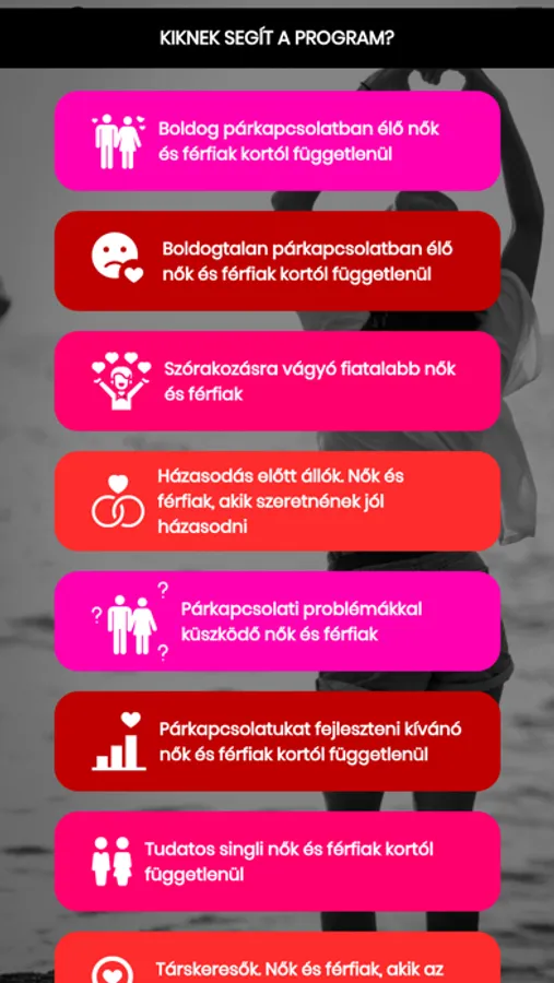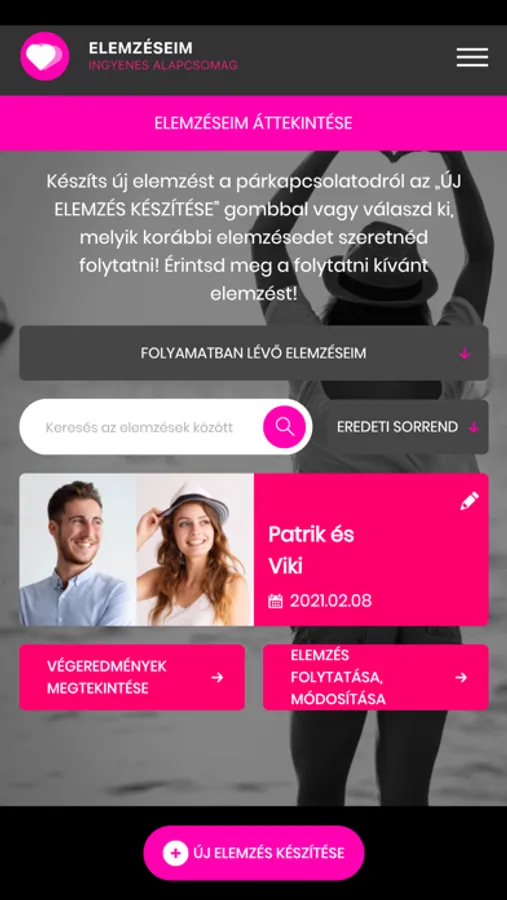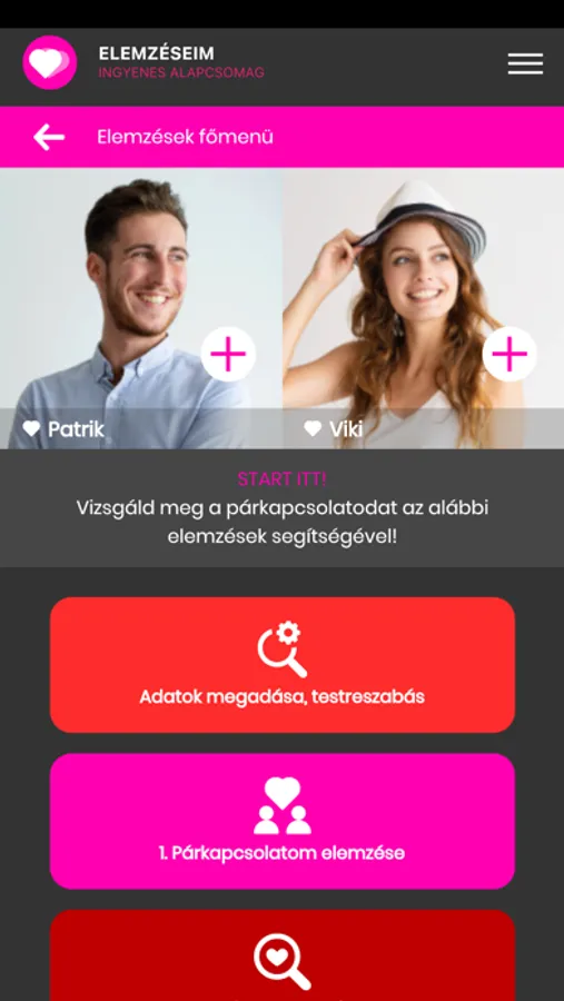 Töltsd le párkapcsolat elemző applikációnkat és 1-2 perces gyors elemzések segítségével bárkit, bármilyen párkapcsolati problémát, bármilyen szemszögből kielemezhetsz, összehasonlíthatsz!