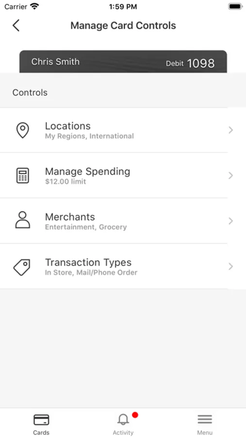 Real-time alerts for PIN and signature transactions keep you informed of your card usage to quickly detect unauthorized or fraudulent activity. Location-Based Controls and Alerts Restrict transactions to merchants near your location (using your phone’s GPS) or by region using city, state, country or zip code on an interactive map.