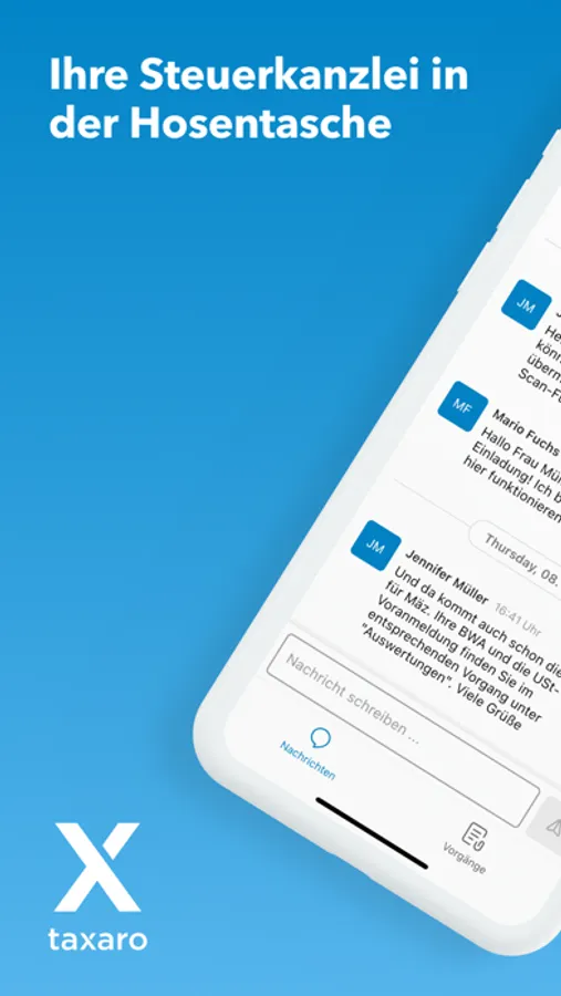 Mit Taxaro wird die Abstimmung mit Ihrer Steuerkanzlei so einfach wie noch nie. Klären Sie spontane Nachfragen jederzeit per Text-Nachricht, scannen Sie Belege für Ihre Buchhaltung oder Steuererklärung und erhalten Sie Auswertungen und Antworten auf Ihre Fragen direkt auf Ihr iPhone. Jederzeit, egal wo Sie sind – einfach und stressfrei.