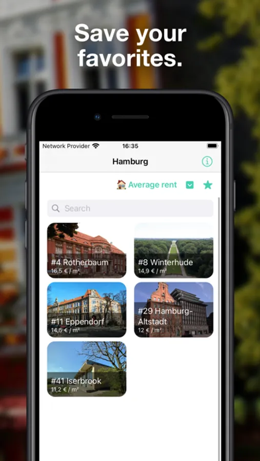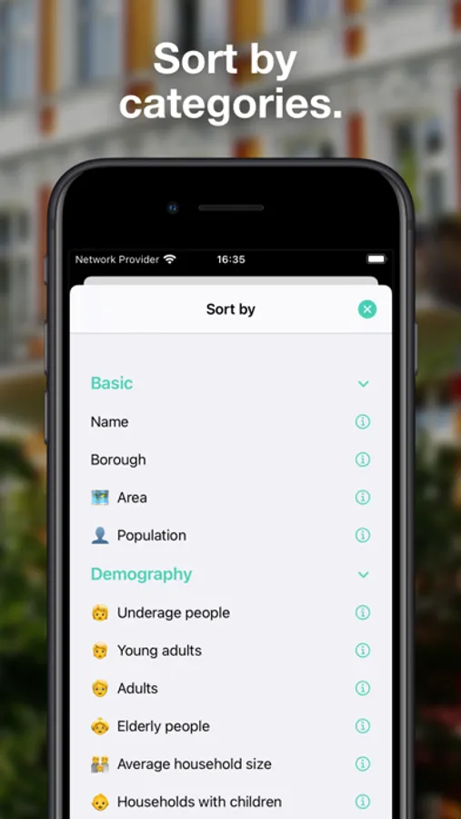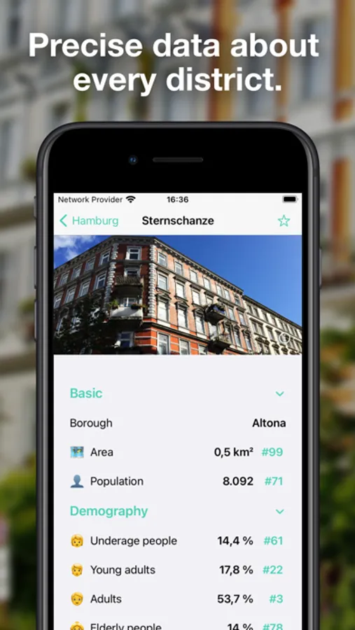 • Get information on all districts such as the average rent, the number of schools and supermarkets, the age distribution and much more