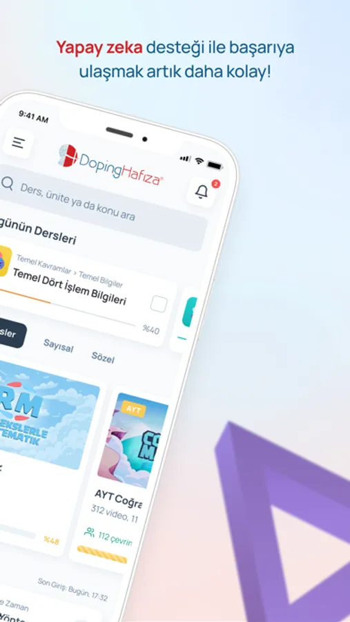 Yapay zekâ teknolojisi ile kendinize özel kişiselleştirilmiş ders çalışma programı oluşturabilirsiniz. Eksik olduğunuz konuları, günlük ders çalışma sürenizi tespit edebilirsiniz. Eksik olduğunuz konuları öğrenmek için birçok farklı hocanın anlatımıyla olan alternatif videoları izleyebilirsiniz. Konuyu detaylı anlamadığınız takdirde de birebir görüşme gerçekleştirebileceğiniz konu anlatımına bağlanabilirsiniz.