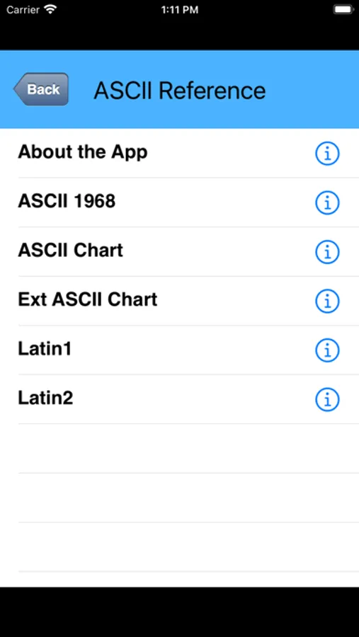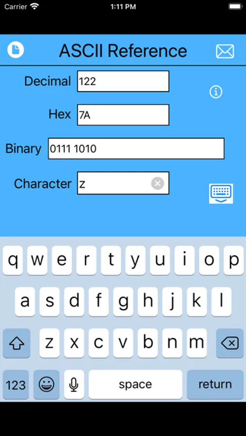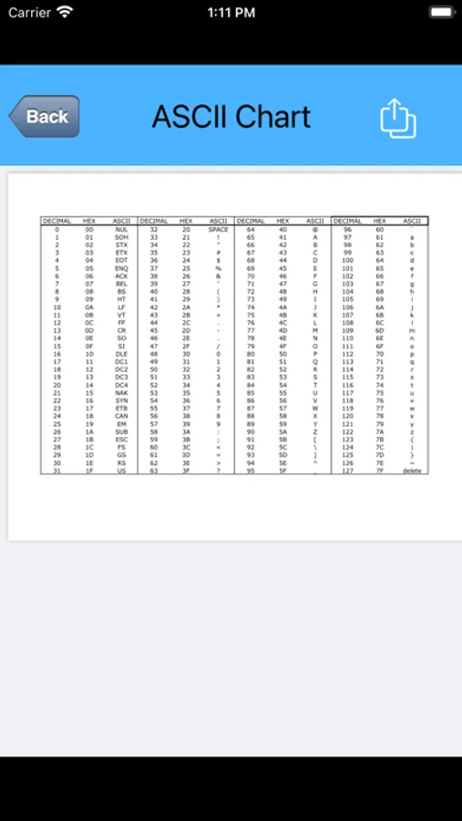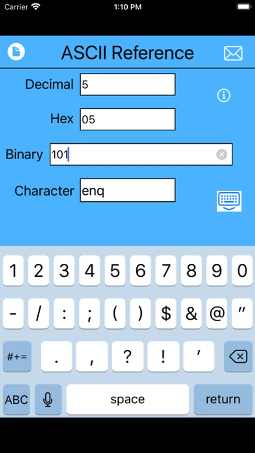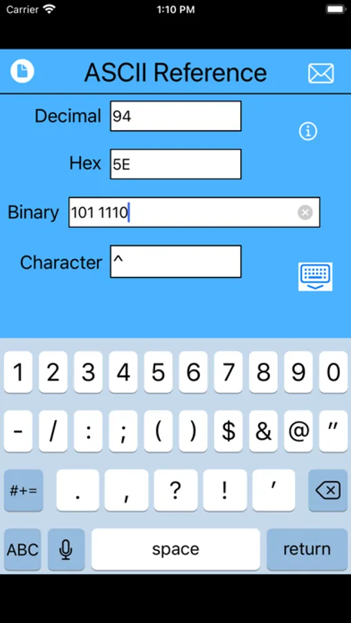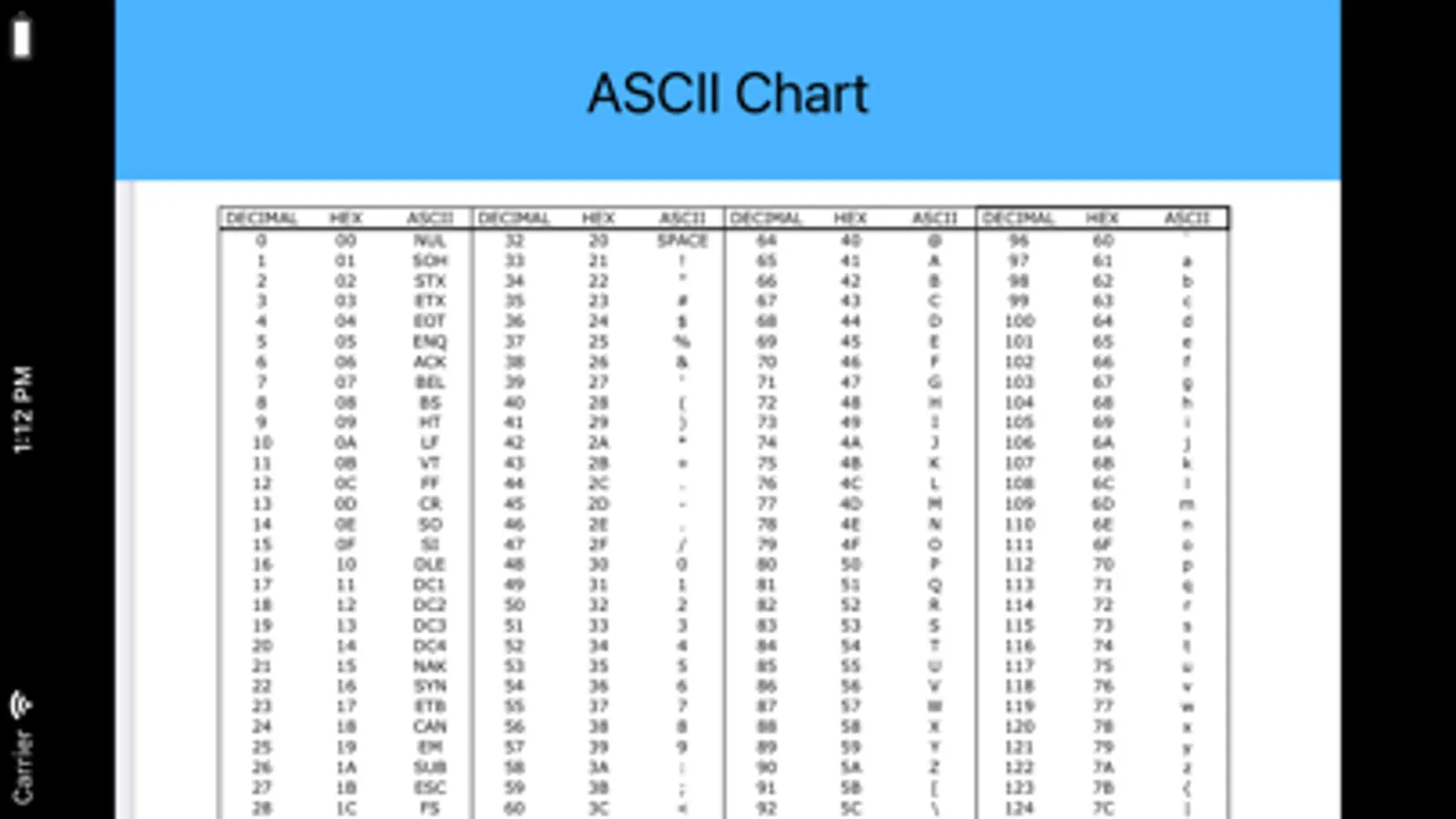 This is a fast and simple-to-use app for viewing ASCII and Unicode code points in decimal, hex, and binary representations.