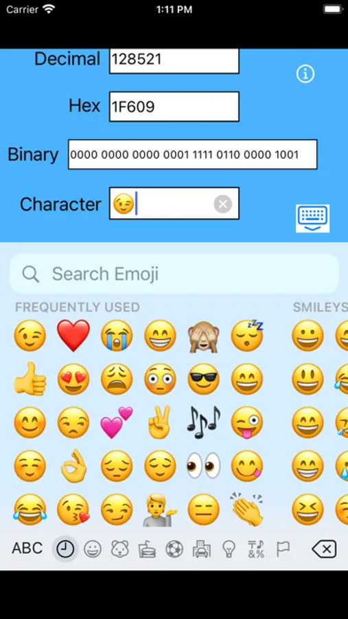 This app supports the entire 17-plane range of Unicode characters. You can enter any displayable character (including emojis) that your iOS keyboard supports and instantly see its code point value in decimal, hex, and binary. The app automatically adjusts the binary data to 8-bit, 16-bit, or 32-bit representation as needed for the particular character you enter.