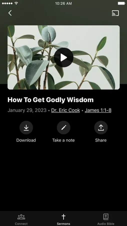 This app will help you stay connected with the day-to-day life of our church. With this app you can: watch or listen to past messages; stay up to date with push notifications; share your favorite messages via Twitter, Facebook, or email; and download messages for offline listening.