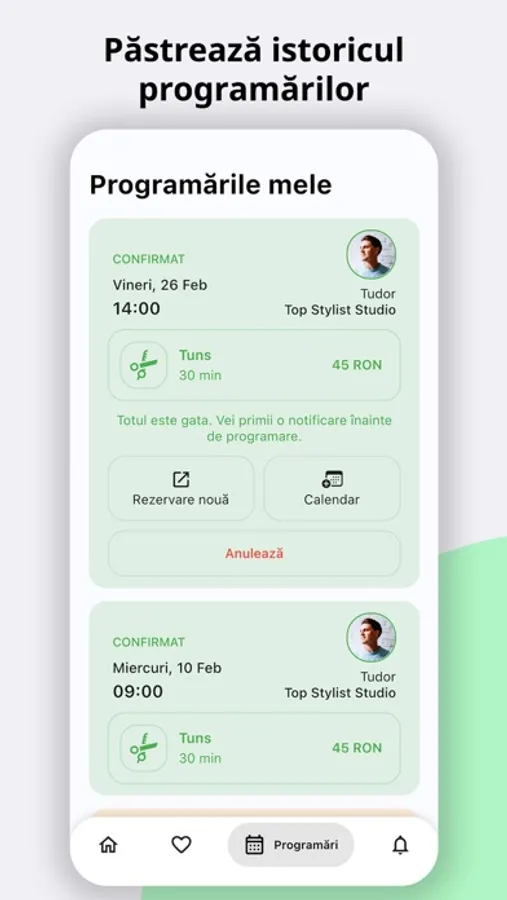 - Bucură-te de simplitatea programărilor online. Primești automat notificări care îți reamintesc de rezervarea următoare.