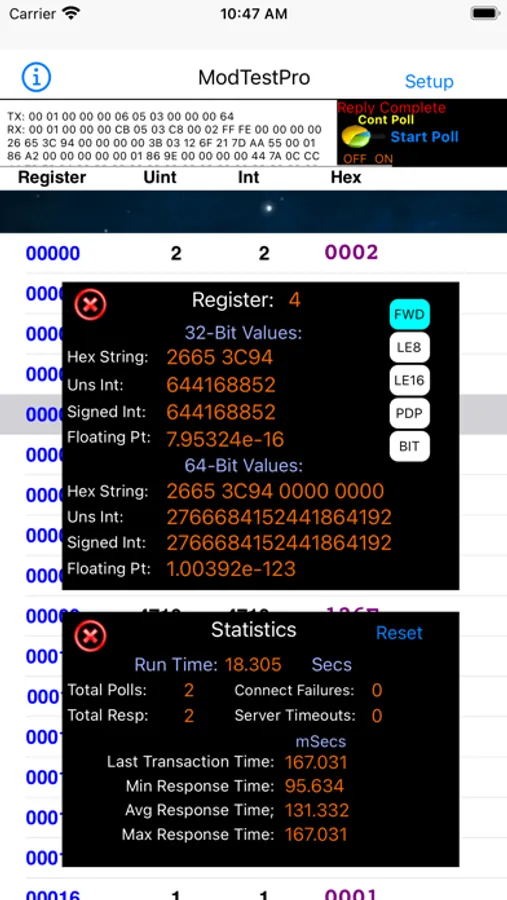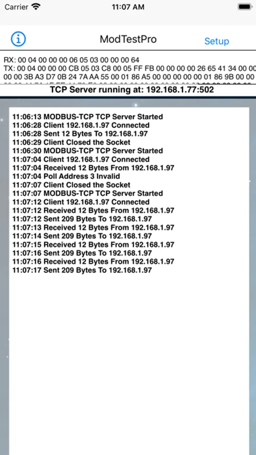 A communication status window will show the raw byte strings that are sent to and received from a remote device. Received data will also be shown in tabular form when in client mode and communication events will be shown when in server mode. The app also tracks a number of communication statistics.