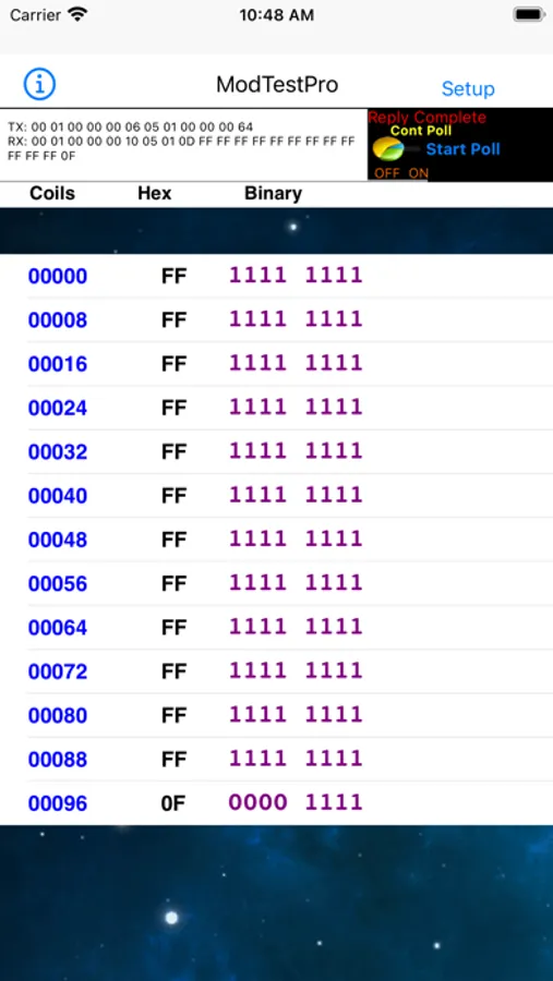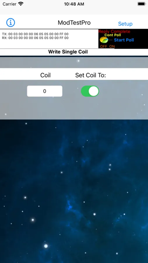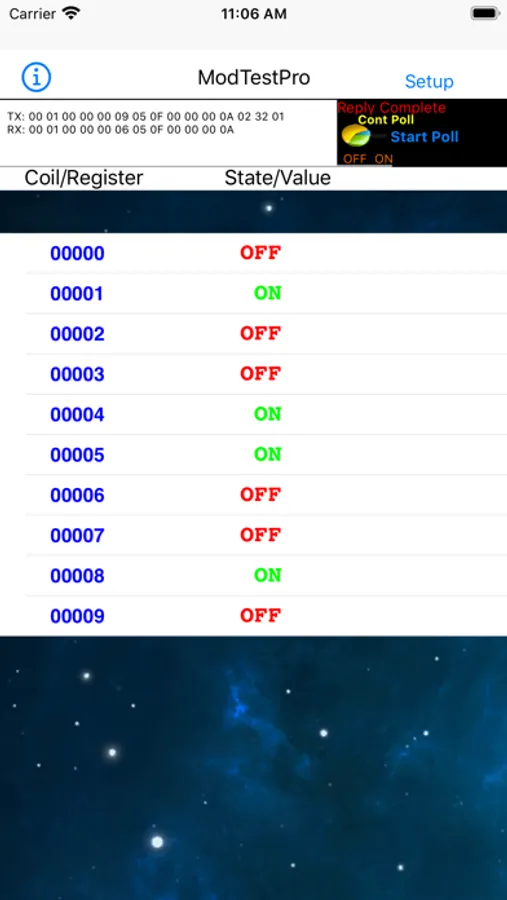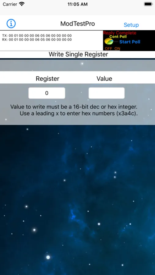 Tap the Setup button to enter the appropriate parameters for your device. Return to the main display to send your poll and view the data (when in client mode) or accept and respond to data requests from a master device (when in server mode).