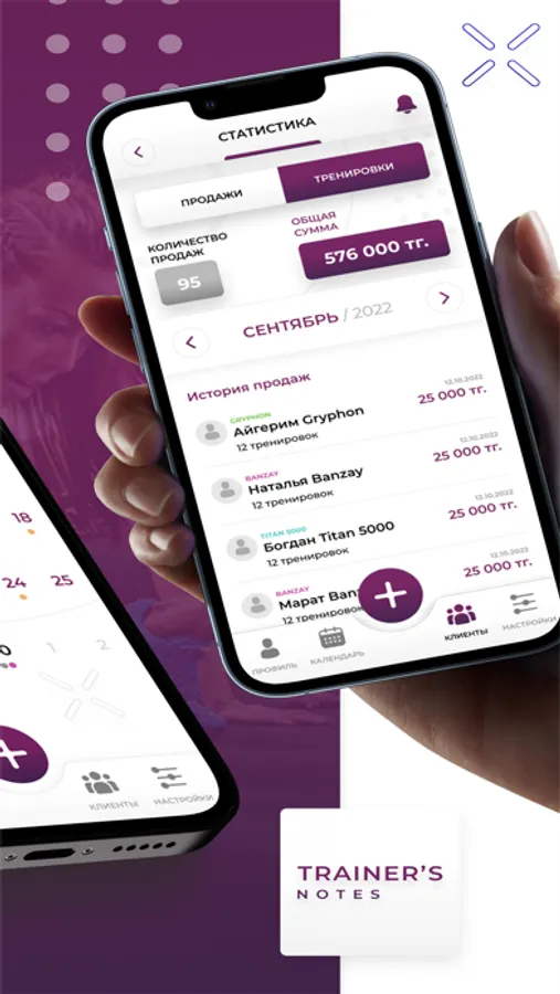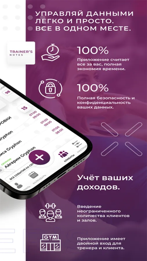 - Полный контроль: программа производит расчет, когда закончится абонемент, есть функция заморозить тренировки, тренер может указать пропуск тренировки.