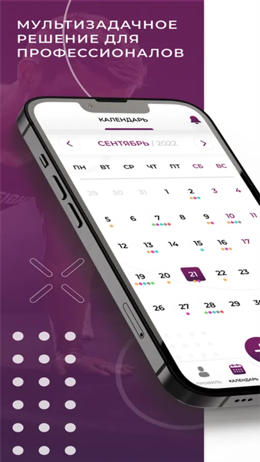 - Календарь: полное расписание тренера, график работы, время тренировок, список групп, сортировка по залам.