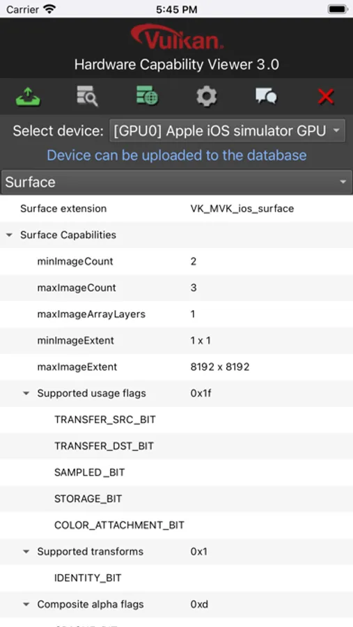 For developers using Vulkan layered over the Metal graphics API, this tool enumerates all the hardware capabilities and limitations of the device it is run on. A report of the current device is uploaded to a central Vulkan Capabilities database at gpuinfo.org where other developers can use this information to ensure their games and 3D apps are ready for as wide a variety of iOS device generations as possible.
