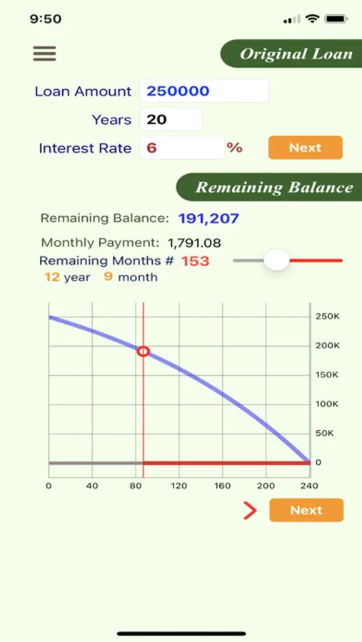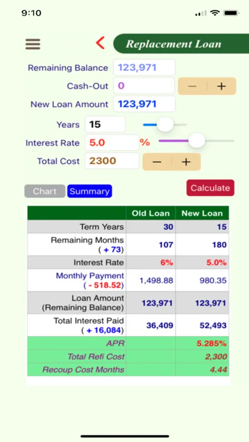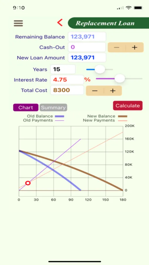 Provides instant graphs and reports when you use sliders or steppers to change the values. Your goal is not only to reduce the monthly payment. You also need to know how long the extra years you need to pay, how much you can save on the interest paid, how soon you can recoup the fees, and what is the real interest rate -- APR. Select the best strategy by yourself.