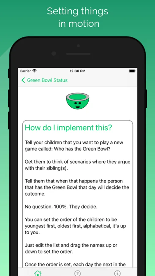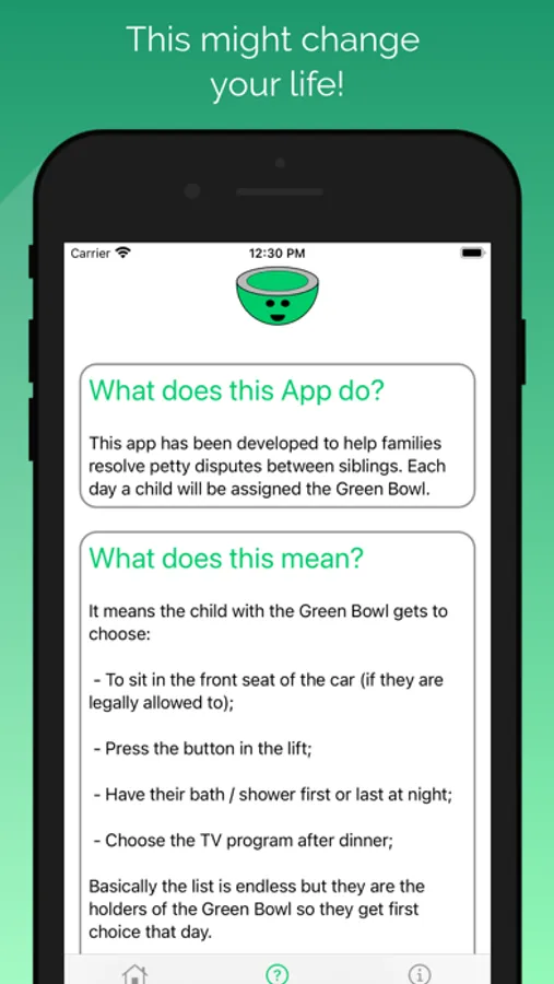 Whoever has the Green Bowl will decide who sits in the front seat, who has the shower first, who chooses what to watch on TV, the list goes on.