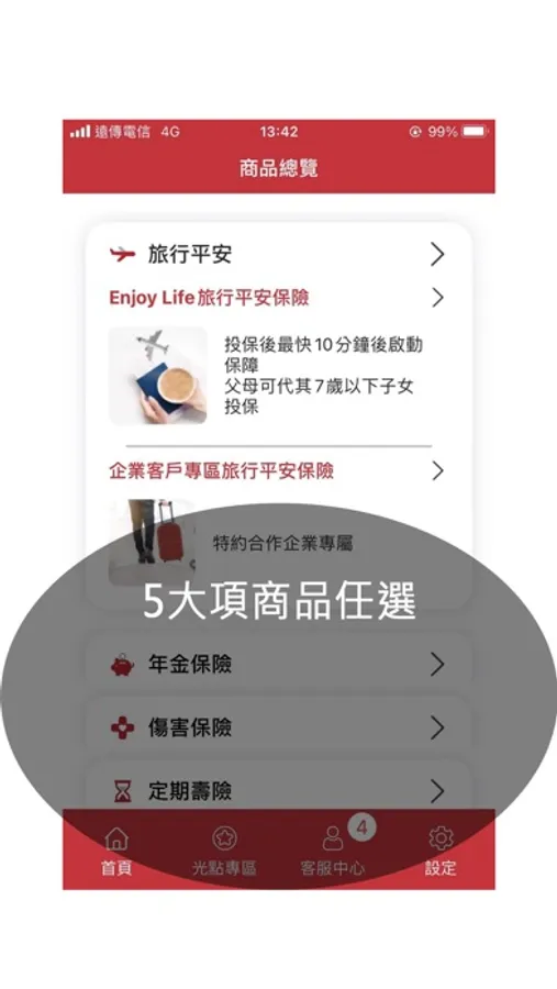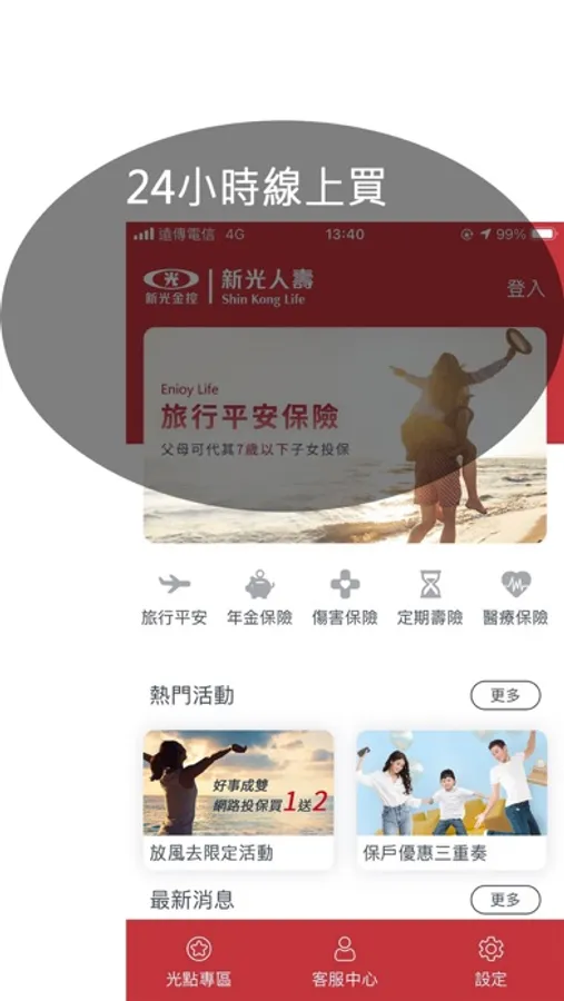 24小時線上保險商品:提供旅行平安保險、年金保險、壽險、健康保險、傷害險、五種類別,共11項保險商品購買。
