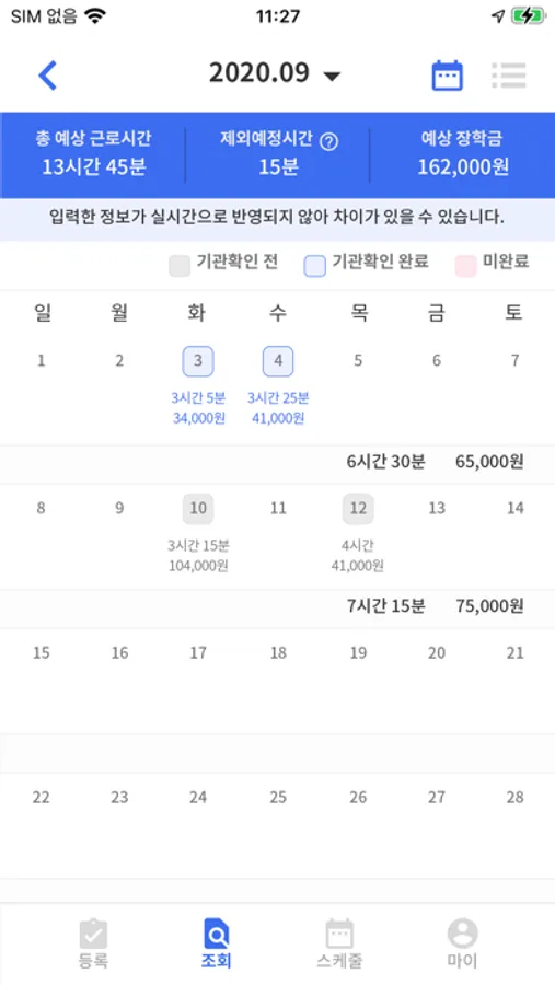 - 출근부(월별) 조회 : 매달 출근부 내역 확인! 예상 장학금 조회