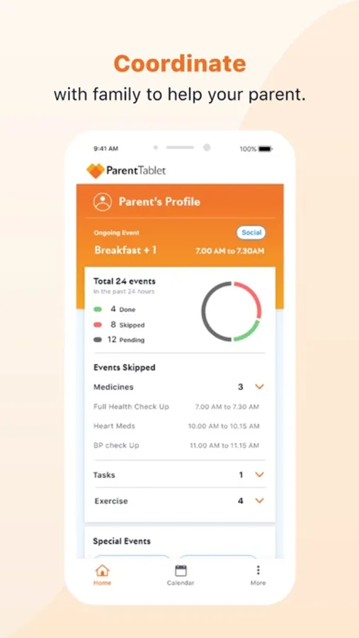 ParentTab Family provides families with the ability to share a calendar, allowing them to keep a track of important events and assist in the coordination or arrange support for seniors in the family. Family coordination to help an elder relative/parent has never been easier.