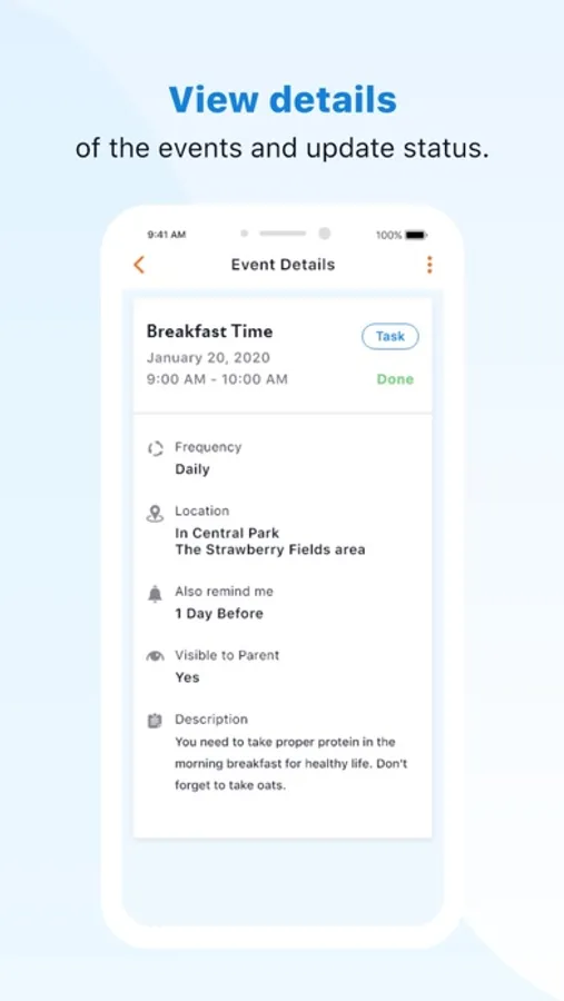 Receive reminders when Mom or Dad has an important appointment or event and get alerted when s/he completes the task or attends the event.