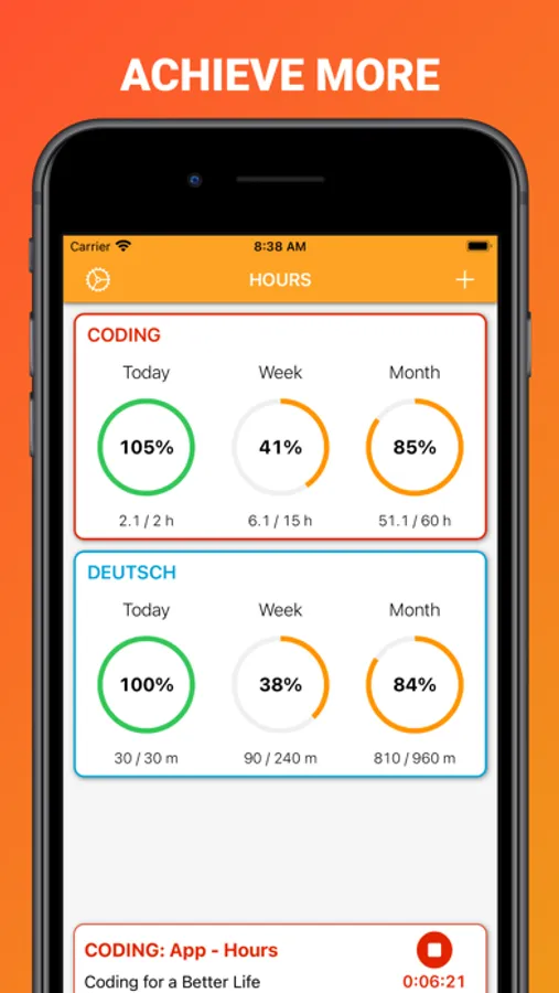 I also love to set weekly and monthly goals for important activities like coding or learning a new language. I wanted to see my daily, weekly and monthly progress towards these goals, so I've created Hours app.